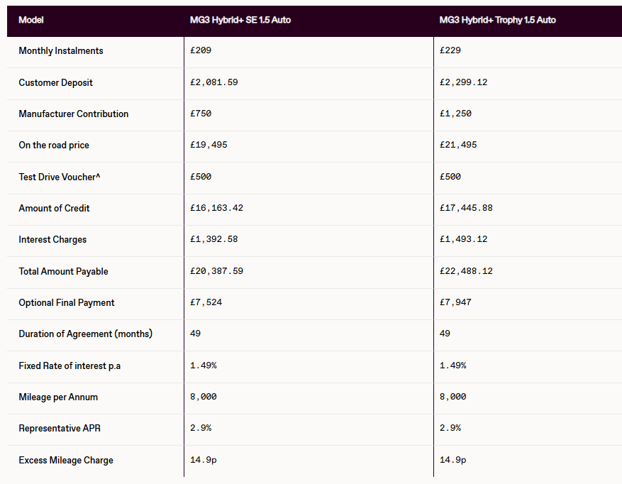 Retail sales only. Subject to availability at participating dealers only on vehicles registered between 01.04.26 and 30.06.26. 2.9% APR representative available on Personal Contract Purchase on all MG3 models. At the end of the agreement there are 3 options: (i) Part exchange the vehicle where equity is available, (ii) Pay the Optional Final Payment to own the vehicle or (iii) Return the vehicle. Further charges may be made subject to the condition or mileage of the vehicle. Finance subject to status. Terms and conditions apply. Applicants must be 18 or over. Guarantee may be required. MG Motor Financial Services, RH1 1SR. Finance is provided by Santander Consumer (UK) PLC trading as MG Motor Financial Services. We, MG Motor UK Ltd, are acting as a credit broker, not a lender, and will introduce you to a number of dealers, who also act as credit brokers. They are not providing you with financial advice and should not be considered impartial. The offer you are seeing is only provided by MG Motor Financial Services but there may be alternative financial products available. If you choose to proceed with an application for finance with MG Motor Financial Services, the dealer, acting as a credit broker, will receive a commission from MG Motor Financial Services. The amount and nature of the commission payable by MG Motor Financial Services to the dealer will be disclosed to you before you enter into your agreement. We, MG Motor UK Ltd, will not receive a commission for introducing you to the dealer.