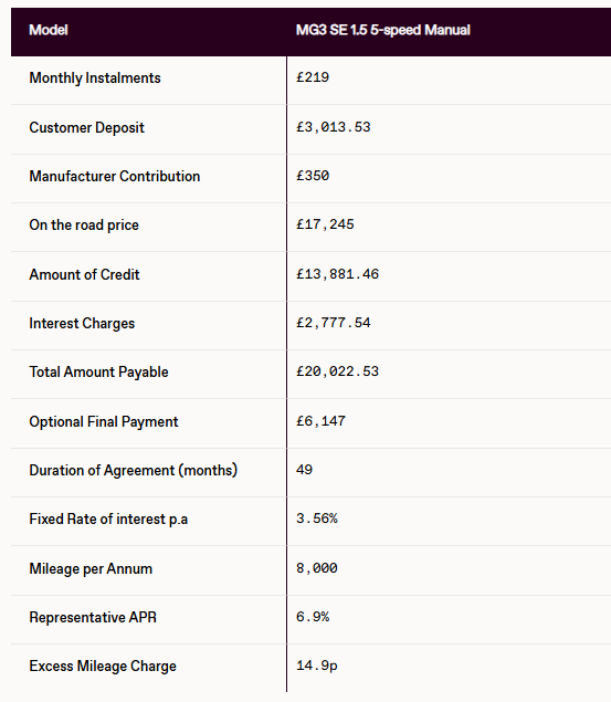 Retail sales only. Subject to availability at participating dealers only on vehicles registered between 01.01.26 and 31.03.26. 6.9% APR representative available on Personal Contract Purchase on all MG3 models. At the end of the agreement there are 3 options: (i) Part exchange the vehicle where equity is available, (ii) Pay the Optional Final Payment to own the vehicle or (iii) Return the vehicle. Further charges may be made subject to the condition or mileage of the vehicle. Finance subject to status. Terms and conditions apply. Applicants must be 18 or over. Guarantee may be required. MG Motor Financial Services, RH1 1SR. Finance is provided by Santander Consumer (UK) PLC trading as MG Motor Financial Services. MG Motor UK Ltd are acting as a credit broker and will introduce you to a number of dealers, who also act as credit brokers. They are not providing you with financial advice and should not be considered impartial. The offer you are seeing is only provided by MG Motor Financial Services but there may be alternative financial products available. If you choose to proceed with an application for finance with MG Motor Financial Services, the dealer, acting as a credit broker, will receive a commission from MG Motor Financial Services. The amount and nature of the commission payable by MG Motor Financial Services to the dealer will be disclosed to you before you enter into your agreement. MG Motor UK Ltd, will not receive a commission for introducing you to the dealer.