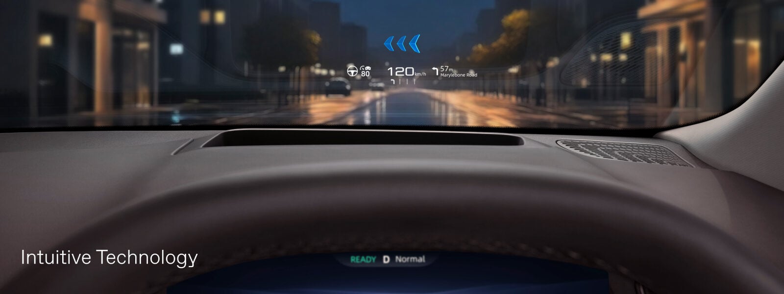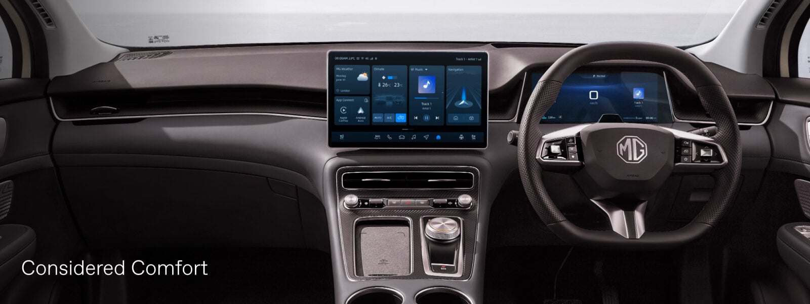 The twin screen layout features a crystal clear 12.8-inch HD touchscreen and a 10.25-inch driver display which work in harmony while the Head-Up Display (HUD)* projects essentials where your focus remains. Configurable to your preference and featuring for the first time in an MG vehicle.