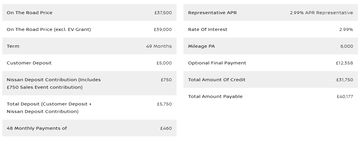 *Offer valid from 8th January 2026 until 9th February 2026 at participating dealers only and subject to vehicle availability. To be eligible, vehicles must be ordered by 9th February 2026 and registered by 31st March 2026. Finance provided by Nissan Financial Services, Rivers Office Park, Denham Way, Maple Cross, Rickmansworth, WD3 9YS. Subject to status. Guarantees and indemnities may be required. You must be at least 18 and a UK resident (excluding the Channel Islands). NISSAN DEPOSIT CONTRIBUTION OF £750 IS ONLY AVAILABLE WHEN TAKEN ON 2.99% APR REPRESENTATIVE PCP NISSAN FINANCIAL SERVICES PRODUCT AND IS AVAILABLE ON ARIYA ADVANCE 63KWH ONLY . Offer based on 6,000 miles pa, excess mileage 8p per mile. Offers not available in conjunction with any schemes or other offers. Vehicle price includes first registration fee and 12 months’ road fund licence. Nissan reserves the right to amend or withdraw offers at any time without prior notice, including in the case of any events or circumstances beyond Nissan’s reasonable control. Terms and conditions apply. Please refer to your local authorised Nissan dealer for further information and exact specifications. Your Nissan dealer is a credit broker and not a lender and can introduce you to a limited number of lenders and their finance products. You must decide whether the finance product is right for you. Lenders will typically pay commission to your Nissan dealer, being either a fixed fee or a fixed percentage of the amount you borrow. Commission rates between lenders could vary, but the commission received by your Nissan dealer does not influence the interest rate you will pay. ²Recommended on the road price includes VAT at the prevailing rate, 12 month Vehicle Excise Duty (determined by Co2 emissions figure and fuel type), First Registration Fee and Electric Car Grant (ECG) where applicable. ECG scheme subject to government terms and conditions.