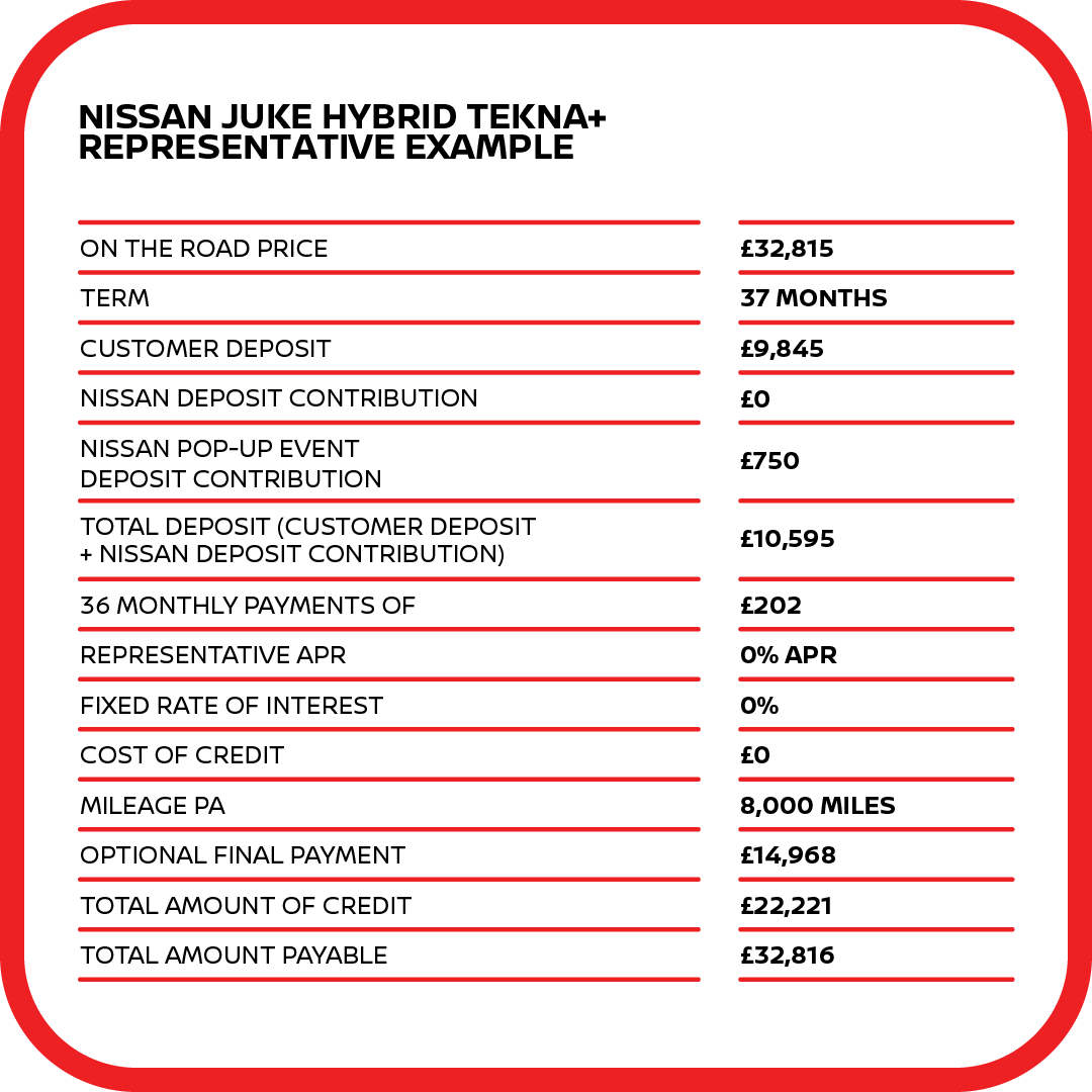 *Offer valid from 8th January 2026 until 9th February 2026 at participating dealers only and subject to vehicle availability. To be eligible, vehicles must be ordered by 9th February 2026 and registered by 31st March 2026. Finance provided by Nissan Financial Services, Rivers Office Park, Denham Way, Maple Cross, Rickmansworth, WD3 9YS. Subject to status. Guarantees and indemnities may be required. You must be at least 18 and a UK resident (excluding the Channel Islands). ADDITIONAL NISSAN DEPOSIT CONTRIBUTION OF £750 IS ONLY AVAILABLE WHEN TAKEN ON 24-36 MONTH 0% APR REPRESENTATIVE PCP NISSAN FINANCIAL SERVICES PRODUCT. Applies to: Qashqai (all models); Juke (except N-Sport); ARIYA (NISMO only); and X-Trail (except e-POWER grades; e-4ORCE (Acenta Premium, N-Connecta, N-Trek, Tekna, Tekna+) . 30% MINIMIUM DEPOSIT REQUIRED ON QASHQAI, X-TRAIL AND JUKE. ARIYA NISMO 0% APR REQUIRES 36-48 MONTH TERM. Offer based on 8,000 miles pa, excess mileage 8p per mile. Offers not available in conjunction with any schemes or other offers. Vehicle price includes first registration fee and 12 months’ road fund licence. Nissan reserves the right to amend or withdraw offers at any time without prior notice, including in the case of any events or circumstances beyond Nissan’s reasonable control. Terms and conditions apply. Please refer to your local authorised Nissan dealer for further information and exact specifications. Your Nissan dealer is a credit broker and not a lender and can introduce you to a limited number of lenders and their finance products. You must decide whether the finance product is right for you. Lenders will typically pay commission to your Nissan dealer, being either a fixed fee or a fixed percentage of the amount you borrow. Commission rates between lenders could vary, but the commission received by your Nissan dealer does not influence the interest rate you will pay.