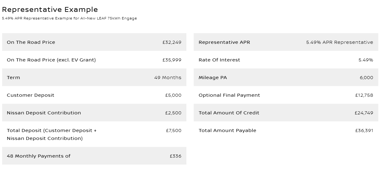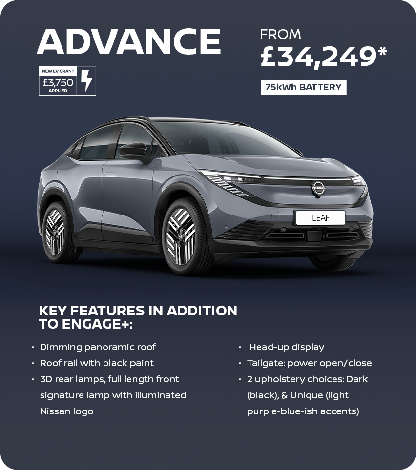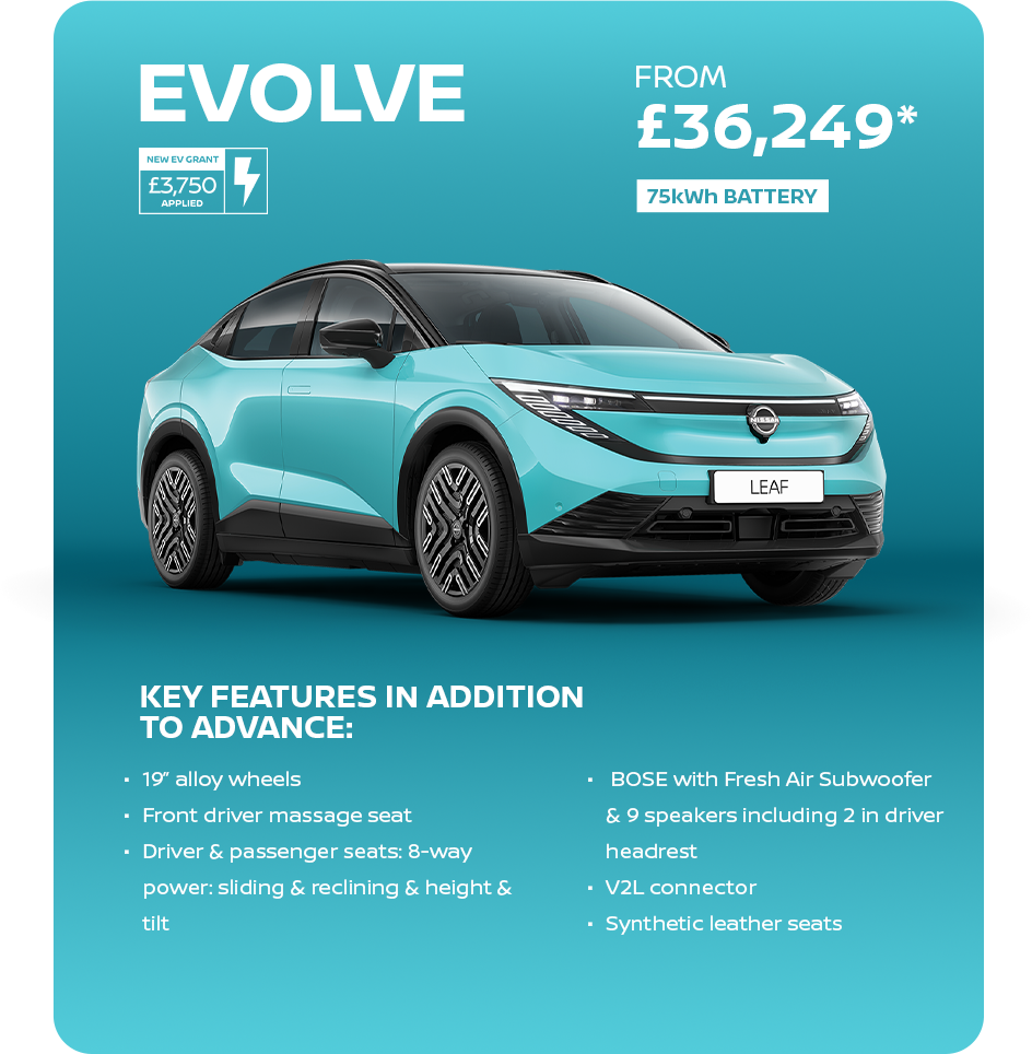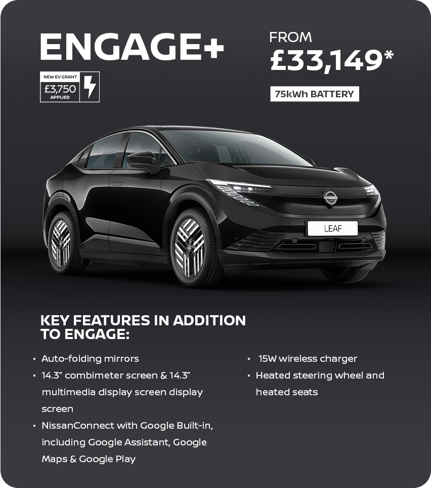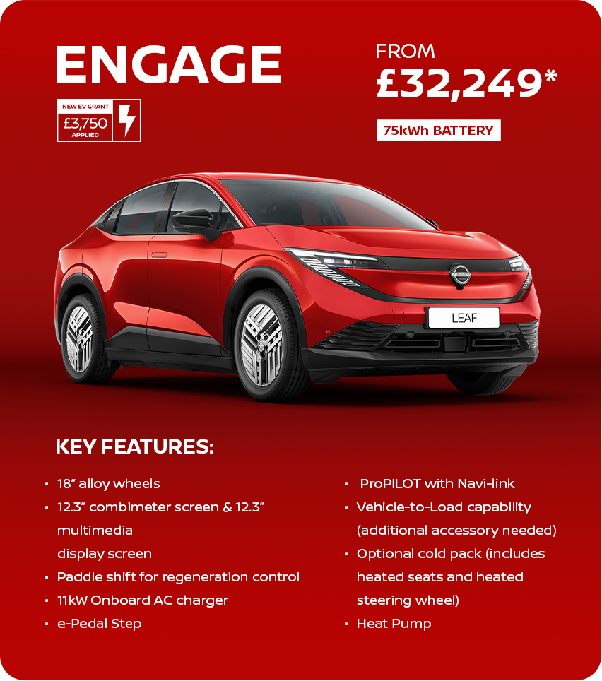 **Offer valid from 15th December 2025 until 31st March 2026 at participating dealers only and subject to vehicle availability. To be eligible, vehicles must be ordered by 31st March 2026 and registered by 30th June 2026. Finance provided by Nissan Financial Services, Rivers Office Park, Denham Way, Maple Cross, Rickmansworth, WD3 9YS. Subject to status. Guarantees and indemnities may be required. You must be at least 18 and a UK resident (excluding the Channel Islands). NISSAN DEPOSIT CONTRIBUTION OF Ā£2,500 IS ONLY AVAILABLE WHEN TAKEN ON 5.49% APR REPRESENTATIVE PCP NISSAN FINANCIAL SERVICES PRODUCT AND IS AVAILABLE ON ALL-NEW LEAF ENGAGE GRADE ONLY . Offer based on 6,000 miles pa, excess mileage 8p per mile. Offers not available in conjunction with any schemes or other offers. Vehicle price includes first registration fee and 12 monthsā road fund licence. Nissan reserves the right to amend or withdraw offers at any time without prior notice, including in the case of any events or circumstances beyond Nissanās reasonable control. Terms and conditions apply. Please refer to your local authorised Nissan dealer for further information and exact specifications. Your Nissan dealer is a credit broker and not a lender and can introduce you to a limited number of lenders and their finance products. You must decide whether the finance product is right for you. Lenders will typically pay commission to your Nissan dealer, being either a fixed fee or a fixed percentage of the amount you borrow. Commission rates between lenders could vary, but the commission received by your Nissan dealer does not influence the interest rate you will pay. ²Recommended on the road price includes VAT at the prevailing rate, 12 month Vehicle Excise Duty (determined by Co2 emissions figure and fuel type), First Registration Fee and Electric Car Grant (ECG) where applicable. ECG scheme subject to government terms and conditions.