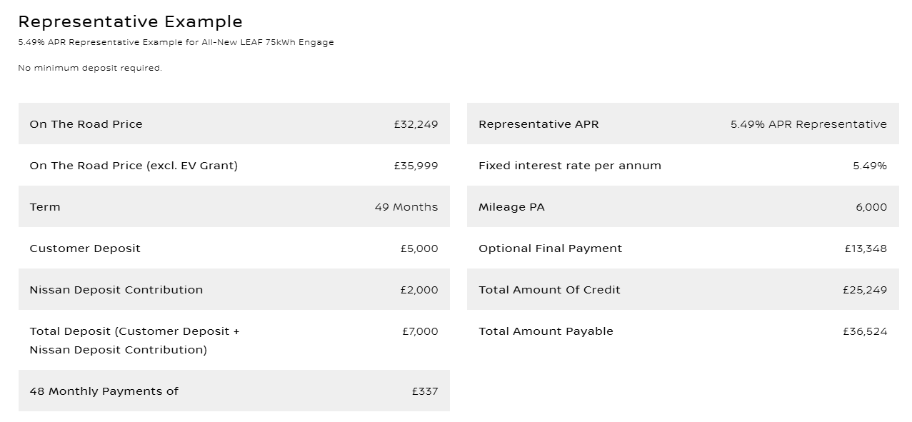 **Offer valid from 1st April 2026 until 30th June 2026 at participating dealers only and subject to vehicle availability. To be eligible, vehicles must be ordered by 30th June 2026 and registered by 30th September 2026. Finance provided by Nissan Financial Services, Rivers Office Park, Denham Way, Maple Cross, Rickmansworth, WD3 9YS. Subject to status. Guarantees and indemnities may be required. You must be at least 18 and a UK resident (excluding the Channel Islands). NISSAN DEPOSIT CONTRIBUTION OF Ā£2,000 IS ONLY AVAILABLE WHEN TAKEN ON 5.49% APR REPRESENTATIVE PCP NISSAN FINANCIAL SERVICES PRODUCT AND IS AVAILABLE ON ALL-NEW LEAF ENGAGE GRADE ONLY . Offer based on 6,000 miles pa, excess mileage 8p per mile. Offers not available in conjunction with any schemes or other offers. Vehicle price includes first registration fee and 12 monthsā road fund licence. Nissan reserves the right to amend or withdraw offers at any time without prior notice, including in the case of any events or circumstances beyond Nissanās reasonable control. Terms and conditions apply. Please refer to your local authorised Nissan dealer for further information and exact specifications. Your Nissan dealer is a credit broker and not a lender and can introduce you to a limited number of lenders and their finance products. You must decide whether the finance product is right for you. Lenders will typically pay commission to your Nissan dealer, being either a fixed fee or a fixed percentage of the amount you borrow. Commission rates between lenders could vary, but the commission received by your Nissan dealer does not influence the interest rate you will pay. ²Recommended on the road price includes VAT at the prevailing rate, 12 month Vehicle Excise Duty (determined by Co2 emissions figure and fuel type), First Registration Fee and Electric Car Grant (ECG) where applicable. ECG scheme subject to government terms and conditions.