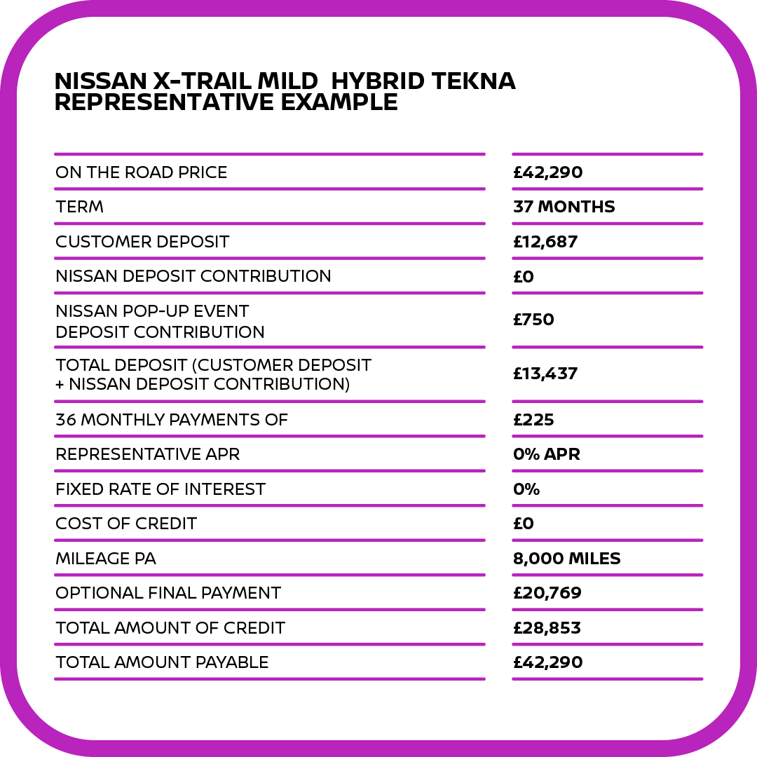 Join us at the Nissan Pop-Up event and you could get an extra £750 deposit contribution and enjoy 0% APR Representative when you order a Nissan X-Trail between 8 January – 9 February*.
