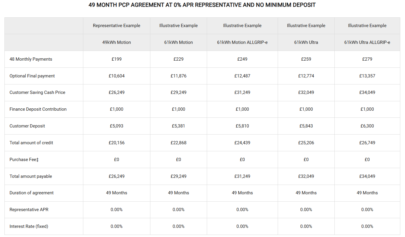 †e VITARA 49kWh Motion Auto: ÂŁ199 a month. 0% APR Representative, 49-month PCP agreement. ÂŁ5,093 customer deposit & ÂŁ10,604 optional final payment. 32,667 miles per annum. Payment excludes optional metallic paint at ÂŁ550. HP finance also available. Credit subject to status, UK residents 18+, Suzuki Financial Services Ltd, St William House, Tresillian Terrace, Cardiff, CF10 5BH. With Personal Contract Purchase (PCP) you have the option after you have paid all of the regular monthly repayments to: (1) Return the vehicle and not pay the Optional Final Repayment. In this example if the vehicle has exceeded 32,667 miles, a charge of 9.6p (including VAT at 20%) will apply per excess mile. If the vehicle is in good condition (fair wear and tear accepted) and has not exceeded 32,667 miles you will have nothing further to pay. (2) Pay the Optional Final Repayment to own the vehicle or (3) Part exchange the vehicle subject to settlement of your existing finance agreement; new finance agreements are subject to status. Excludes Channel Islands and Isle of Man Dealers. Valid from 1st April 2026 until 30th June 2026.Â