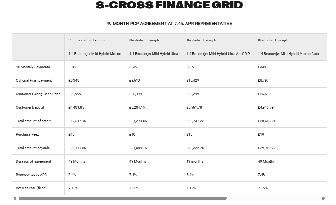 *S-Cross 1.4 Boosterjet Mild Hybrid Motion: ÂŁ319 a month. 7.4% APR Representative, 49-month PCP agreement. ÂŁ4,481.85 customer deposit & ÂŁ8,348 optional final payment. 8,000 miles per annum. HP finance also available. Credit subject to status, UK residents 18+, Suzuki Financial Services Ltd, St William House, Tresillian Terrace, Cardiff, CF10 5BH. With Personal Contract Purchase (PCP) you have the option after you have paid all of the regular monthly repayments to: (1) Return the vehicle and not pay the Optional Final Repayment. In this example if the vehicle has exceeded 32,667 miles, a charge of 4.8p (including VAT at 20%) will apply per excess mile. If the vehicle is in good condition (fair wear and tear accepted) and has not exceeded 32,667 miles you will have nothing further to pay. (2) Pay the Optional Final Repayment to own the vehicle or (3) Part exchange the vehicle subject to settlement of your existing finance agreement; new finance agreements are subject to status. Excludes Channel Islands and Isle of Man Dealers. Valid from 1st April 2026 until 30th June 2026. Offers may be varied or withdrawn at any time.