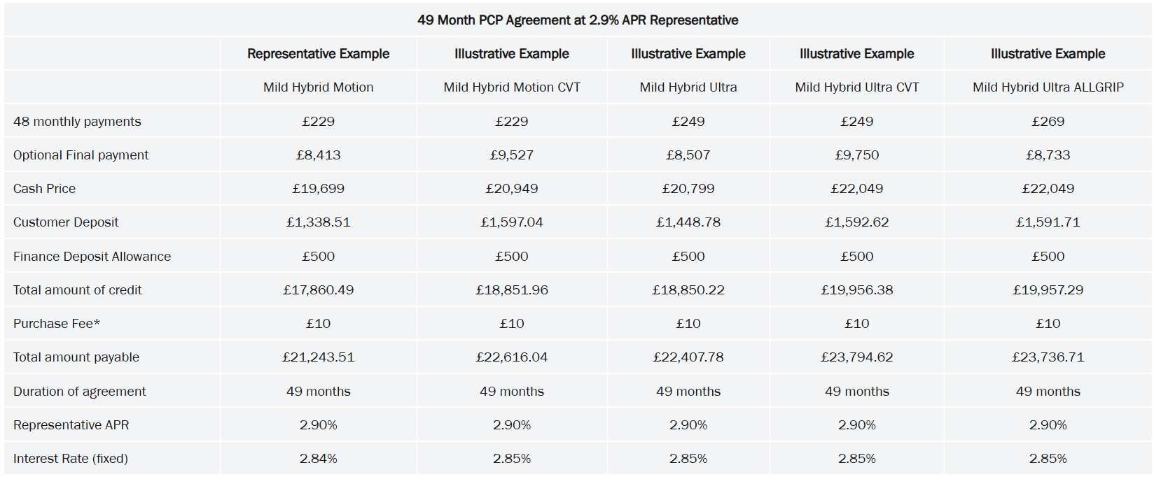 | Suzuki Swift Ultra ALLGRIP | £299 | £500 | £299 | 49 months | 8,000 | 2.9% |