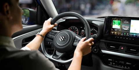 All central controls are thoughtfully angled towards the driver, providing enhanced convenience and helping maintain focus on the road. The flat-bottom steering wheel brings a sporty touch to the new Swift, ensuring comfort in the ideal driving position.