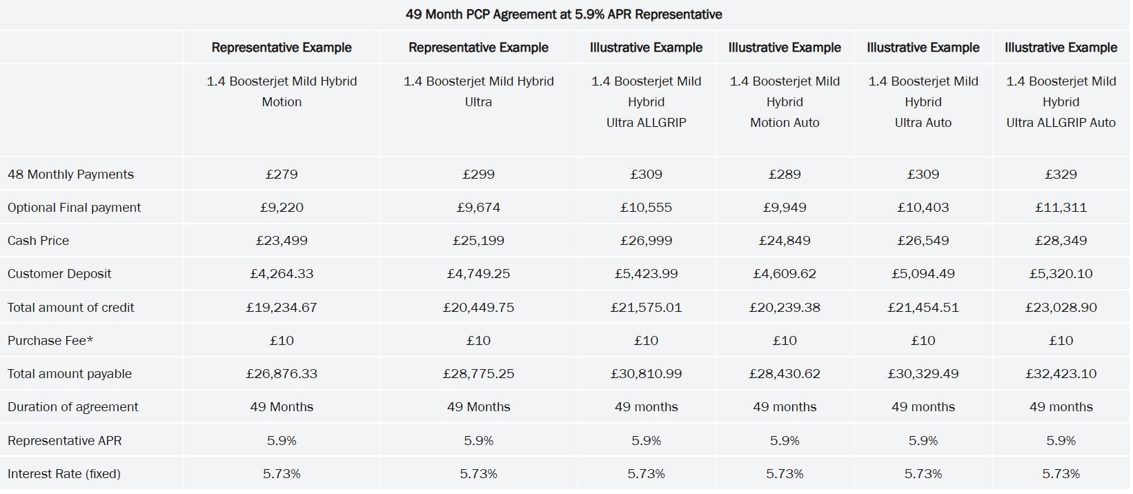 †Vitara 1.4 Boosterjet Mild Hybrid Motion: £279 a month. 5.9% APR Representative, 49-month PCP agreement. £4,264.33 customer deposit & £9,220 optional final payment. 8,000 miles per annum. HP finance also available. Credit subject to status, UK residents 18+, Suzuki Financial Services Ltd, St William House, Tresillian Terrace, Cardiff, CF10 5BH. With Personal Contract Purchase (PCP) you have the option after you have paid all of the regular monthly repayments to: (1) Return the vehicle and not pay the Optional Final Repayment. In this example if the vehicle has exceeded 32,667 miles, a charge of 4.8p (including VAT at 20%) will apply per excess mile. If the vehicle is in good condition (fair wear and tear accepted) and has not exceeded 32,667 miles you will have nothing further to pay. (2) Pay the Optional Final Repayment to own the vehicle or (3) Part exchange the vehicle subject to settlement of your existing finance agreement; new finance agreements are subject to status. Excludes Channel Islands and Isle of Man Dealers. Valid from 1st October 2025 until 31st December 2025. Offers may be varied or withdrawn at any time.